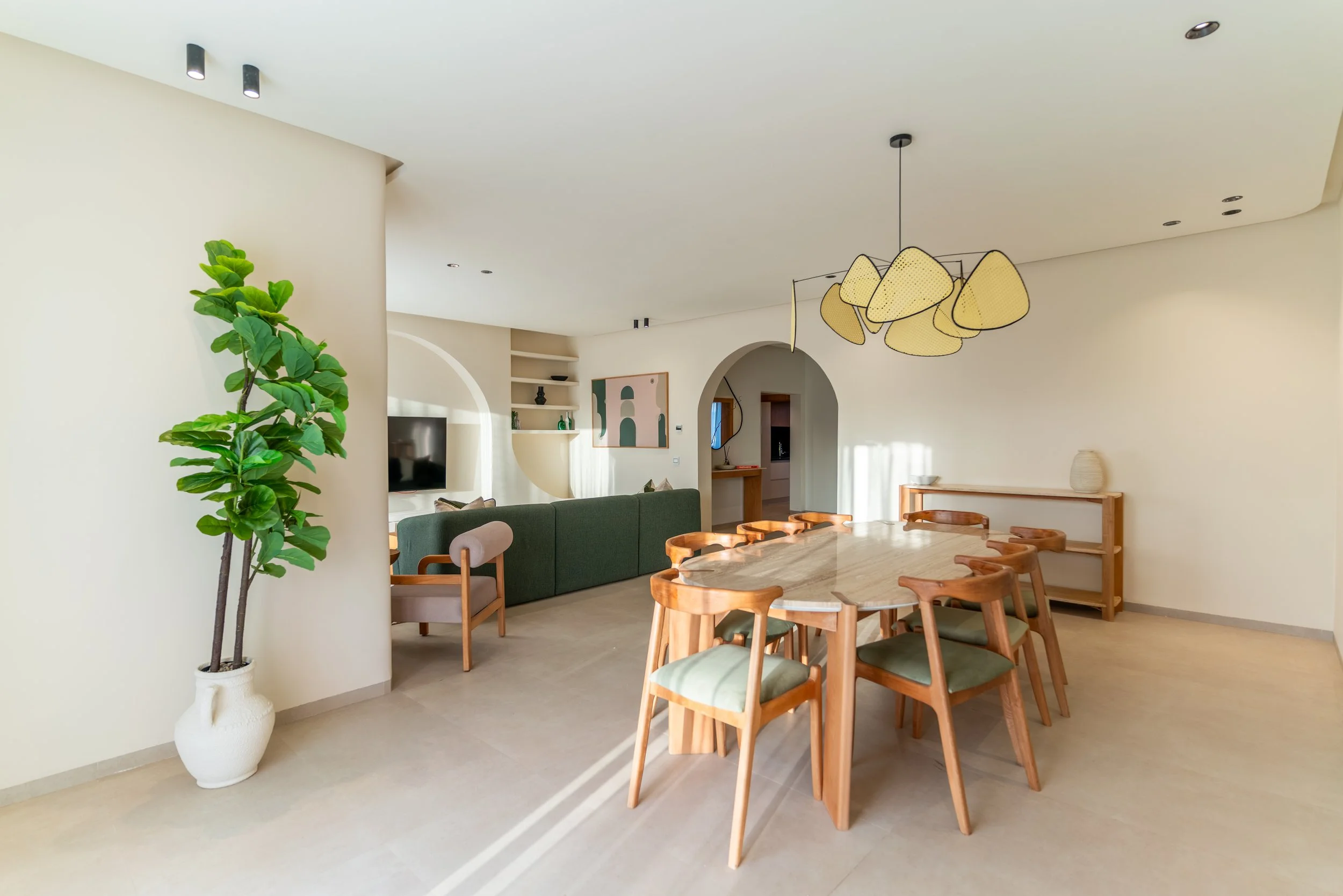 Profitez d'une villa design 4 chambres dans une résidence sécurisée, à seulement 20 minutes de Marrakech avec piscine privée, d'un jardin et d'une table basse extérieure avec des chaises pour se détendre. À l'intérieur, il y a un salon confortable, un coin repas et une cuisine entièrement équipée.